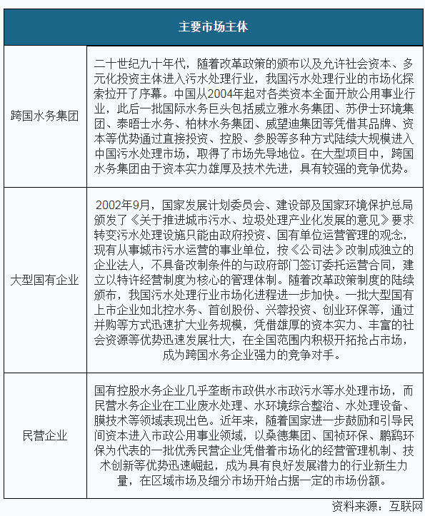當前在我國污水處理市場上主要有跨國水務巨頭、大型國有上市企業、優秀民營企業三大競爭主體。同時由于我國污水處理行業是由政府特許經營,地方企業憑借20至30年的特許經營權形成區域市場的進入壁壘,市場成“碎片化”分布。目前我國污水處理行業的市場集中度較低。